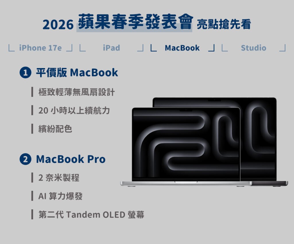 Get a quick overview of the 2026 Apple Spring Event, featuring the iPhone 17e, 12th-gen iPad, M4 iPad Air, affordable MacBook, MacBook Pro with M5 Pro/M5 Max, Mac Studio, and Studio Display. Plus, check out the expected event date, Taiwan livestream time, and product release schedule in one concise guide.cing MagSafe to boost its accessory ecosystem and third-party magnetic accessory market, further increasing services and accessory revenue.
