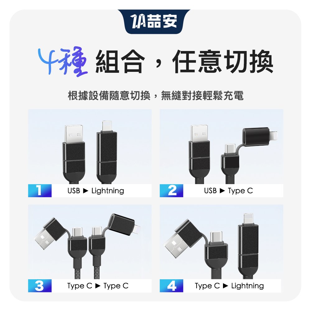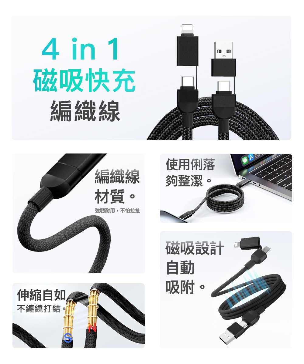 四合一 Type-A/C to Type-C/Lightning 磁吸編織充電線 1.5M