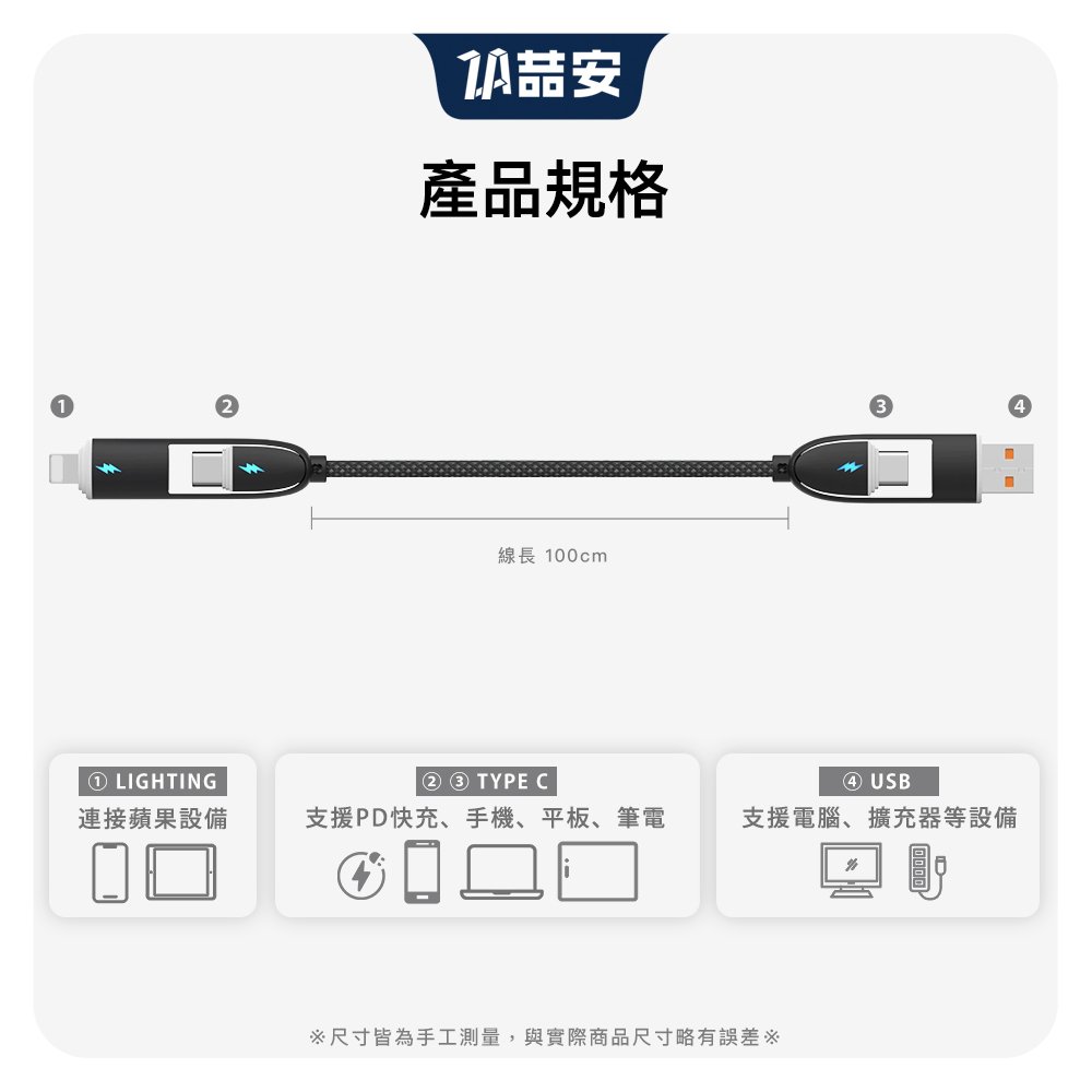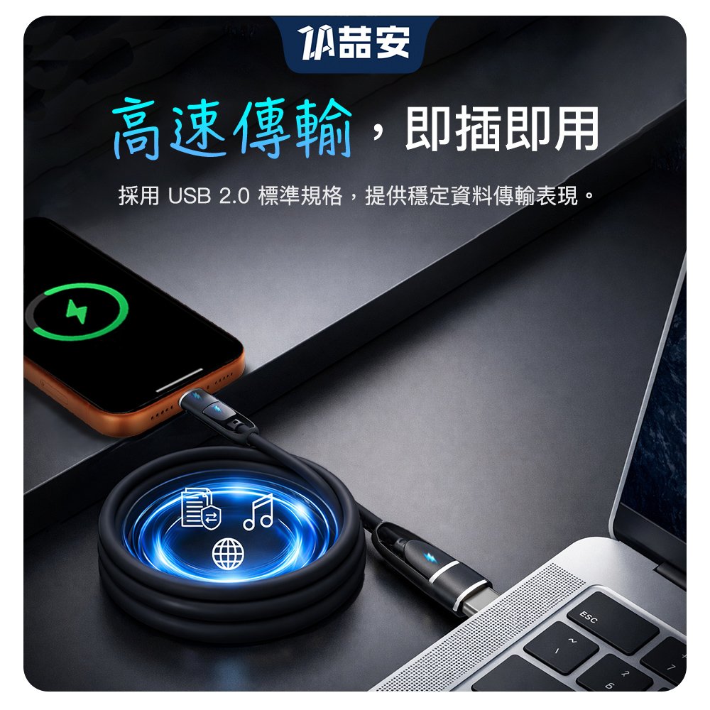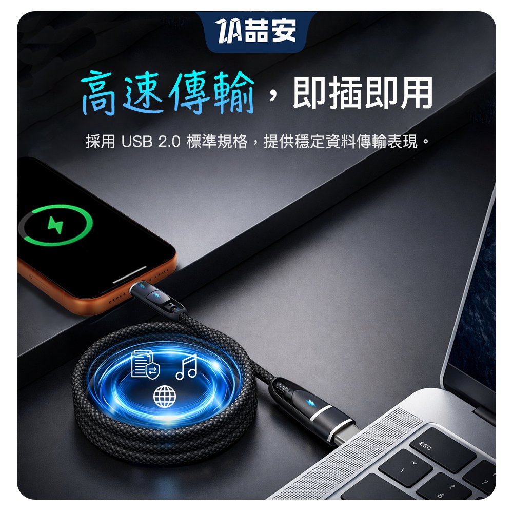 - PD 100W快充、USB 2.0高速傳輸、編織抗拉扯