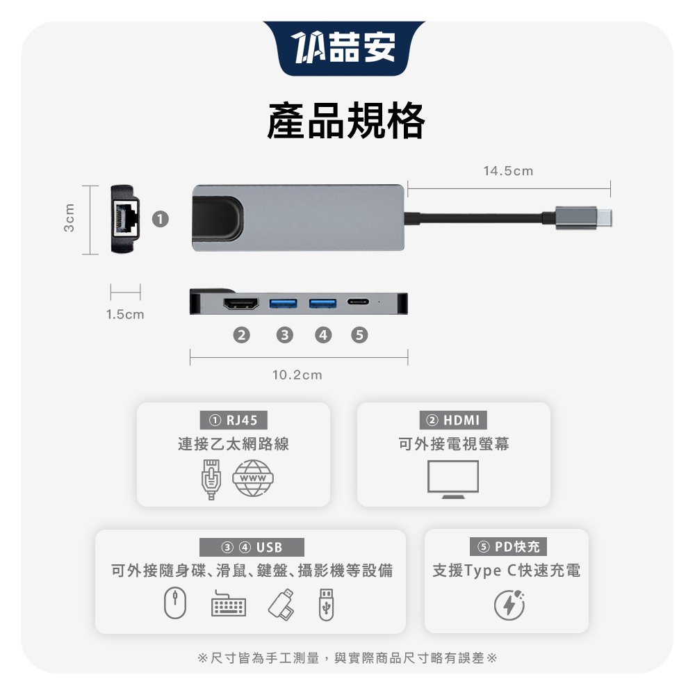 2*Type-A 3.2 Gen1 (支援5 Gbps 高速傳輸) 1*RJ45乙太網路 (支援1 Gbps 高速網路) 1*PD (最高支援 100W 功率) 1*HDMI (最高支援 4K UHD 3840×2160@30Hz,1920×1080@120Hz) 一手機電腦需支援 DP alt mode 功能才能輸出 HDMI 一支援M1~M4晶片的MacBook 一支援iPhone 16/15 一不支援 M1~M3晶片的iPad 一更多相容性請加LINE客服確定 (ID @za3c)